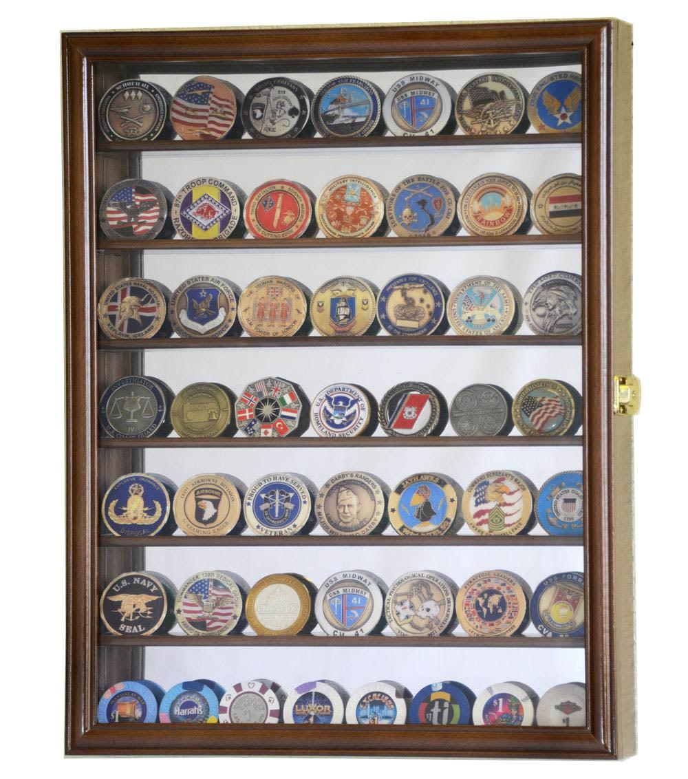 Display it in this beautiful Military Challenge Coin Mirrored Back Display Case Cabinet, designed with a clear plexiglass door and 6 grooved shelves to securely showcase up to 49 coins.