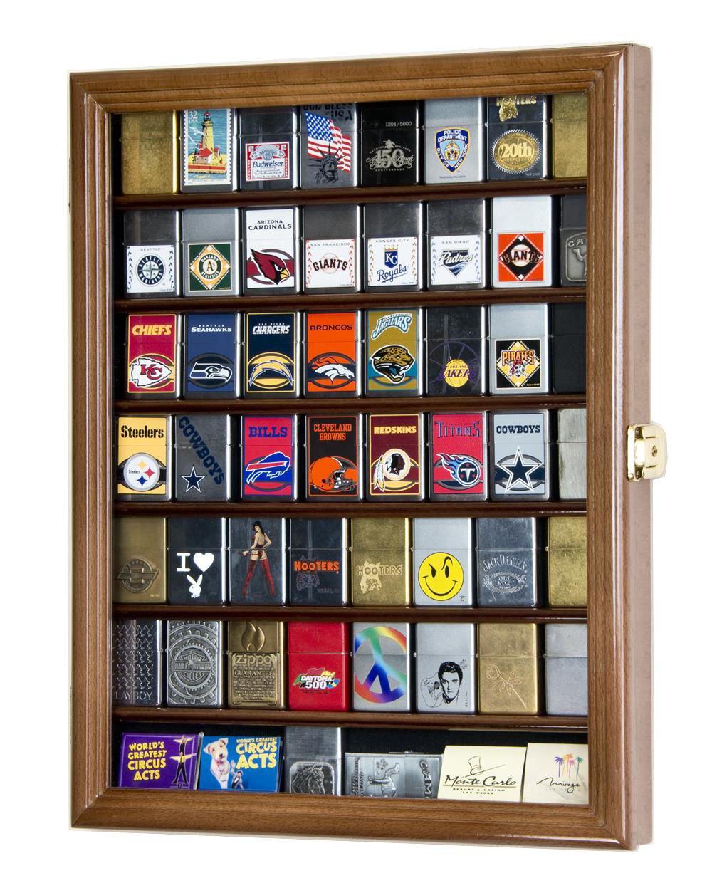 This lighter display case accommodates 56 lighters (7 rows that fit 8 standard-sized lighters) on a black felt background. Shelves have a slight lip to prevent items from falling. Protected by our ultra-clear specially coated plexiglass. Case comes fully assembled. Mounting hardware shipped in the same package.