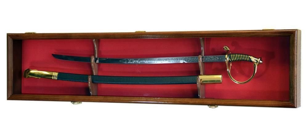 This set of moveable matching sword stand racks displays US Army Officer Saber, US Army NCO Saber, Japanese Samurai Swords, Civil War Swords, etc. Protected by our ultra-clear, specially-coated, UV-protection acrylic. Front opening door. Case comes fully assembled. Mounting hardware is shipped in the same package.